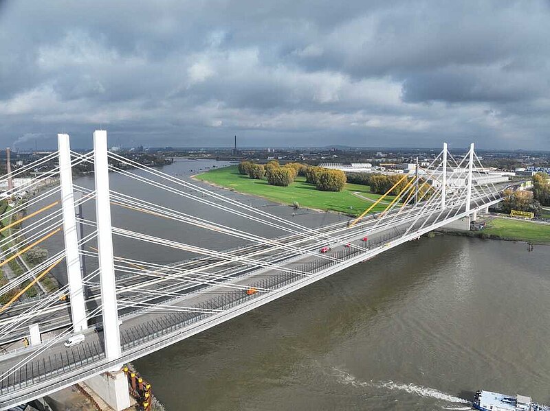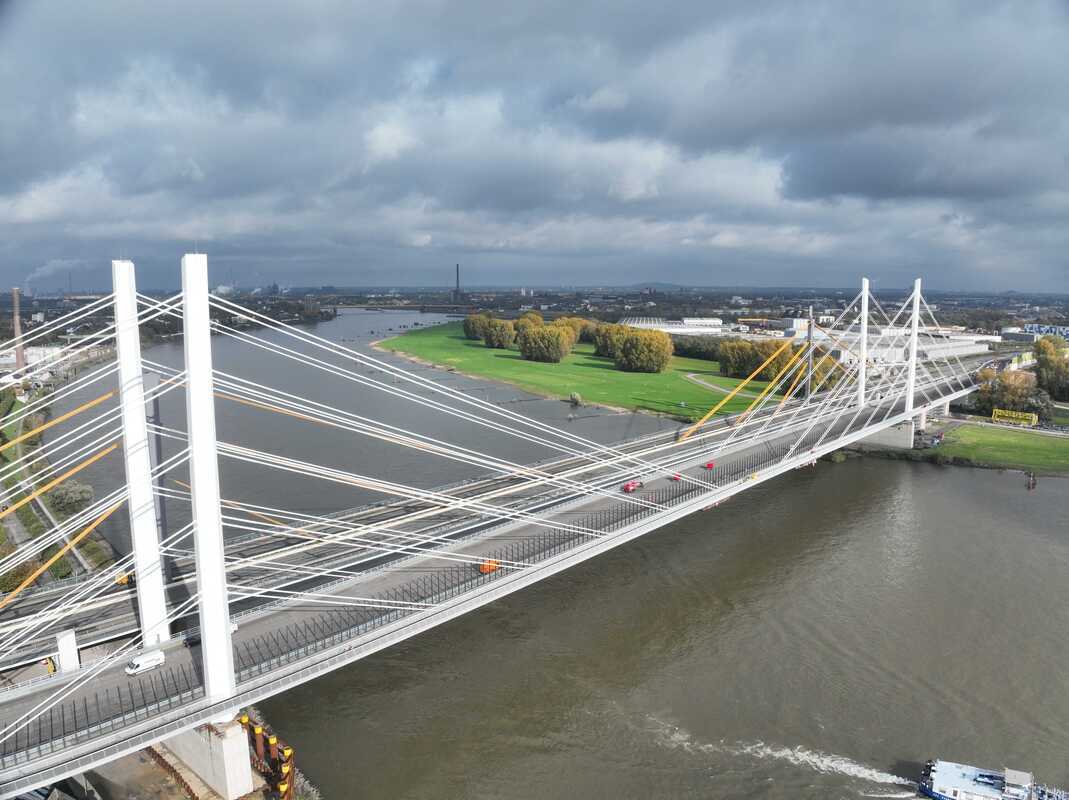 Die A 40-Autobrücke war in den 1970er Jahren ursprünglich für 30.000 Fahrzeuge ausgelegt. Mittlerweile rollen täglich mehr als 100.000 Fahrzeuge über die Brücke. Der Neubau einer leistungsfähigeren Brücke war also somit unumgänglich. Dabei wurde berücksichtigt, dass man bis zum Jahr 2030 mit einem Anstieg des Verkehrs auf 130.000 Fahrzeuge täglich rechnet. Ende 2019 fiel der Startschuss für den achtspurigen Neubau der Rheinbrücke. Mit einem Abstand von 380 Metern zwischen den Pylonen auf beiden Rheinseiten wird die neue Brücke Deutschlands am weitesten gespannte Schrägseilbrücke sein. Die neue Rheinbrücke wird höher, länger und breiter sein als die bisherige Brücke: 75 Meter hoch, 802 Meter lang und 68,25 Meter breit. In beiden Richtungen wird es neben der Fahrbahn neue Geh- und Radwege geben. Sie werden mit Abstand zu den Fahrbahnen gebaut und mit einer 6,5 Meter hohen Lärmschutzwand vom Autobahnverkehr abgeschirmt. Die neue Rheinbrücke wird aus zwei Brückenteilen bestehen, für jede Fahrtrichtung wird eine Brücke errichtet. Zunächst wurde südlich der alten Brücke das erste Teilbauwerk für die Fahrtrichtung nach Osten gebaut. Dieses wurde nach weniger als vier Jahren Bauzeit im November 2023 als erstes Brückenteil der neuen A 40-Autobahnbrücke über den Rhein freigegeben. Der Verkehr, der bis dahin auf der alten Brücke weiterlief, wurde nun auf den neuen Brückenteil verlegt, mit je drei Spuren pro Fahrtrichtung. Momentan beginnt der Abriss der alten Brücke. Voraussichtlich wird das nördliche zweite Brückenteil bis 2026 fertiggestellt. Anschließend wird das südliche Teilbauwerk über eine Distanz von rund 14 Metern in seine endgültige Position verschoben. Jedes Teilbauwerk wird dann über vier Fahrspuren verfügen. Dazu soll die A 40 auf 3,5 Kilometern Länge zwischen den Anschlussstellen Duisburg-Homberg und Duisburg-Häfen bei laufendem Verkehr auf acht Fahrspuren ausgebaut werden.