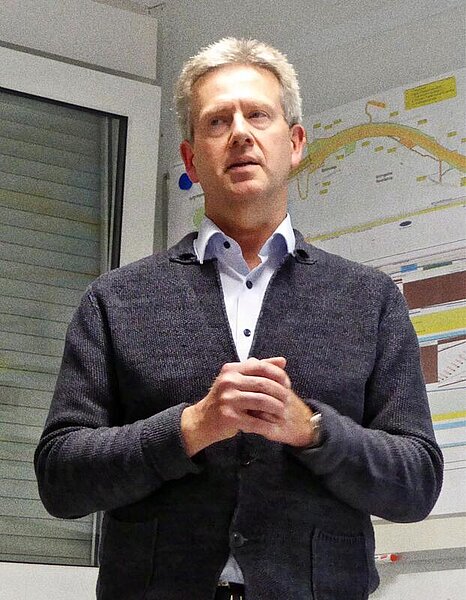 Fachgruppenleiter Volker Schultheiß begrüßte im Projektbüro der Bauleitung „ARGE A 40 Rheinbrücke“ insgesamt 21 interessierte Teilnehmerinnen und Teilnehmer zu diesem Seminar.